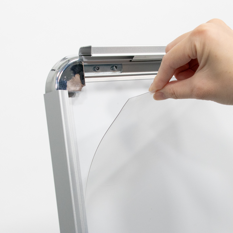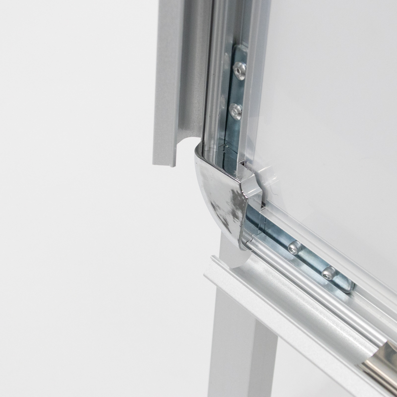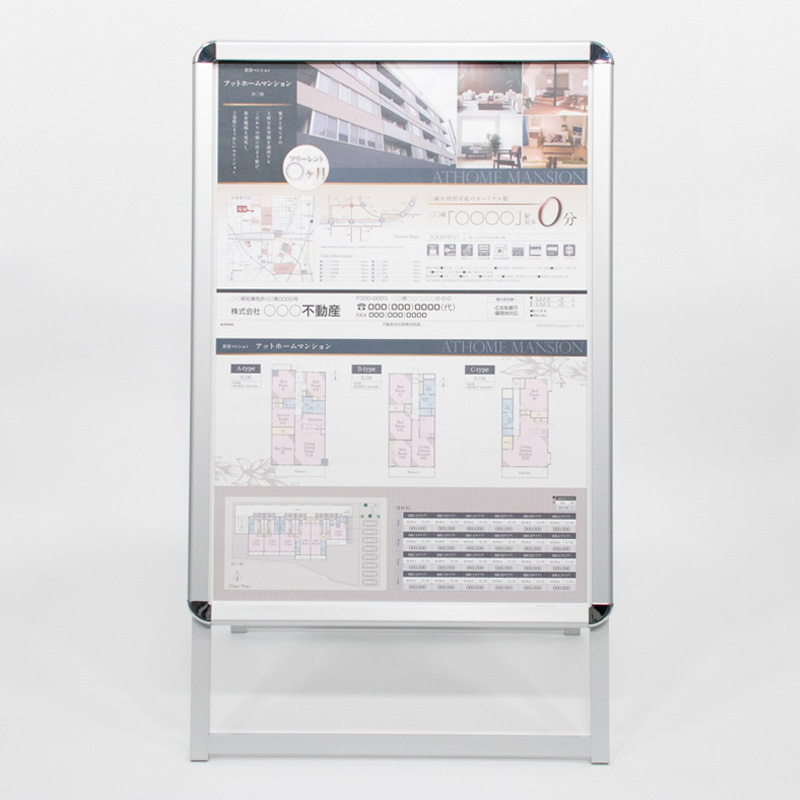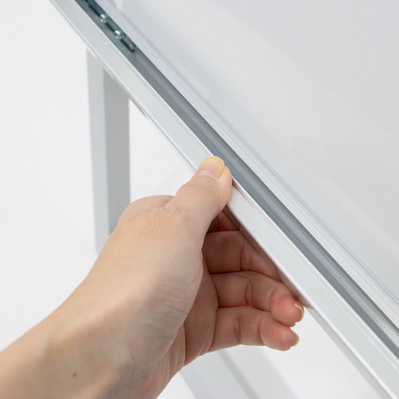 看板前面のフレーム4辺が開閉できるようになっているため、後ろに回らずにポスターやポップの差し替えが簡単に行えます。