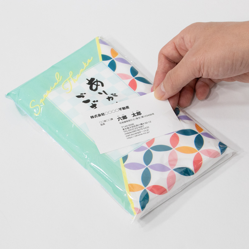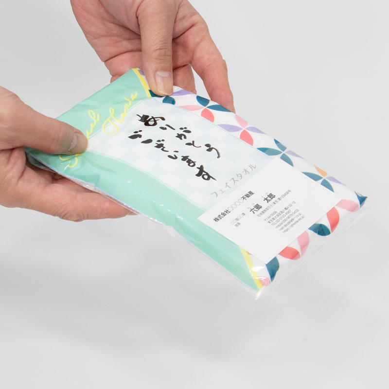名刺と一緒に渡せるから、記憶に残る。必要な分だけ手軽に購入いただける名刺ポケット付きフェイスタオルです。 イベントやご挨拶で、ただ渡すだけでなく「気配り」を伝えられ、貴店のイメージアップにつながります。 実用性も高く、受け取った方に喜ばれるノベルティです。