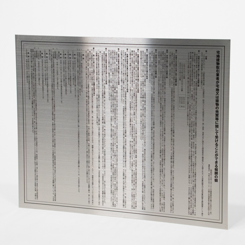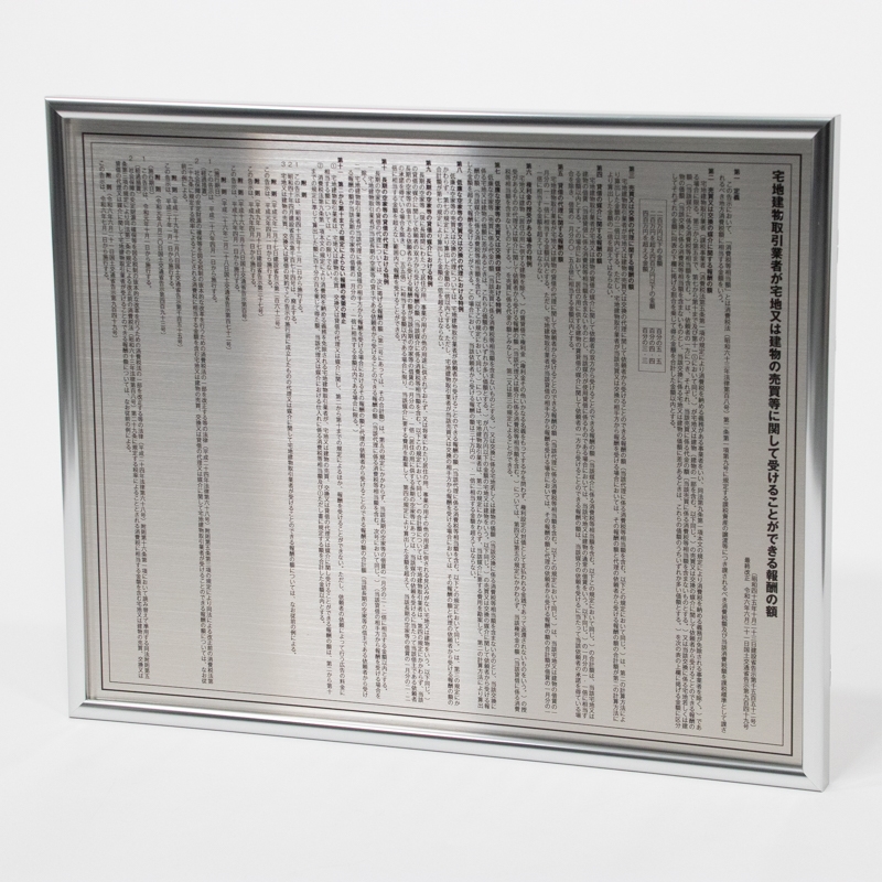 宅地建物取引業法で事務所への掲示義務が定められている不動産報酬額表セット(フレーム付き)です。耐久性に優れたステンレス素材が高級感を演出し、店舗のイメージアップが図れます。
