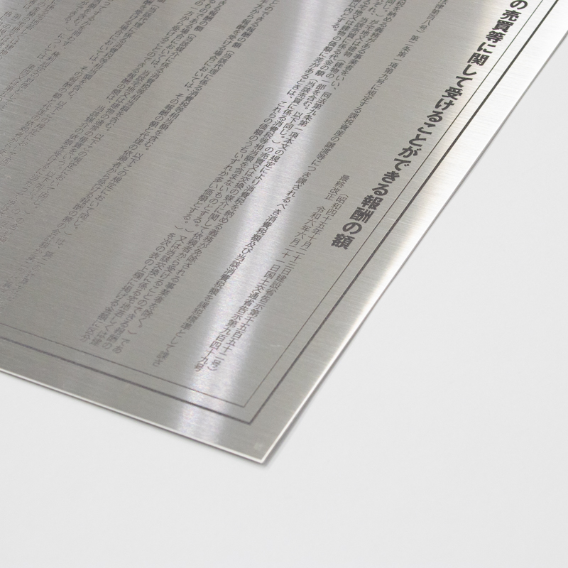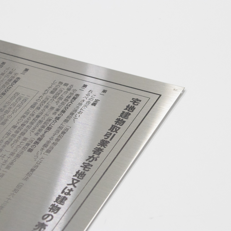 本商品は、ステンレスヘアライン仕上げを採用しており、優れた耐久性と落ち着いた高級感を兼ね備えています。 また、紙製の掲示物と異なり、色あせ・破れ・汚れに強く, 長期間きれいな状態を保てるため、来店したお客様に与える事務所のイメージアップ にも大きく寄与します。 ※ステンレスヘアライン:鉄に「クロム」「ニッケル」を加えた合金鋼で、腐食に強く、強度にも優れた素材。細かな研磨ラインが入ることで上質な質感を持ち、建築物の外装材や設備にも幅広く使われます。