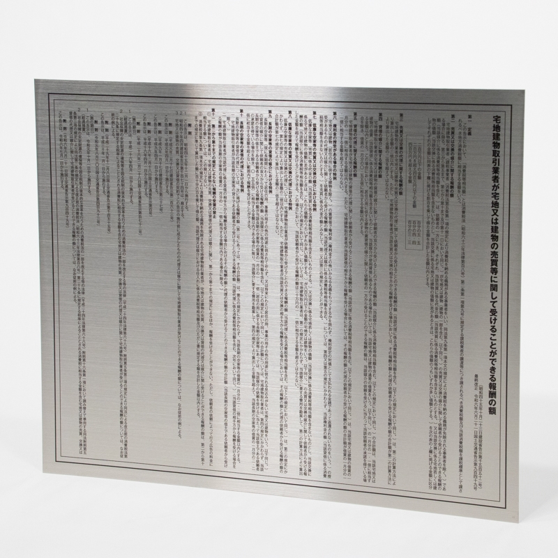 宅地建物取引業法で事務所への掲示義務が定められている不動産報酬額表(パネル単品)です。 耐久性に優れたステンレス素材が高級感を演出し、店舗のイメージアップが図れます。