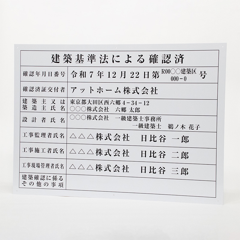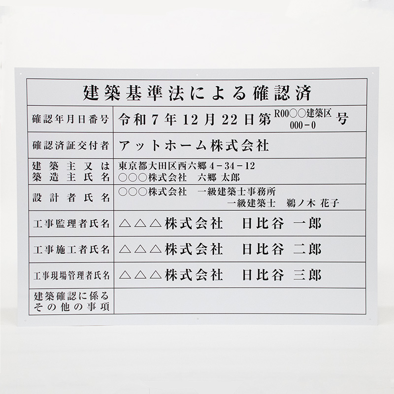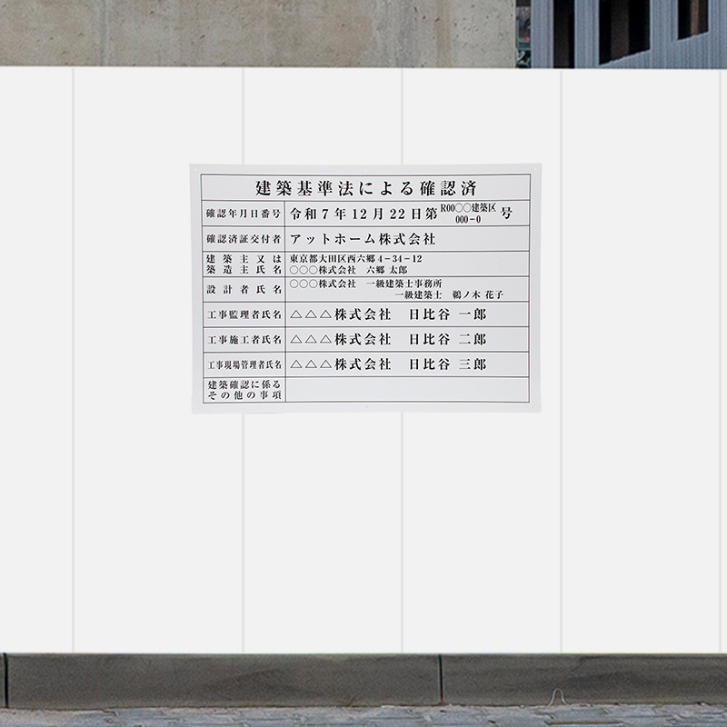 建築基準法に対応した建築基準法確認済看板です。 看板を掲示することで、現場の信頼性を高めます。 耐久性に優れたアルミ複合板で、長期間の使用にも安心です。
